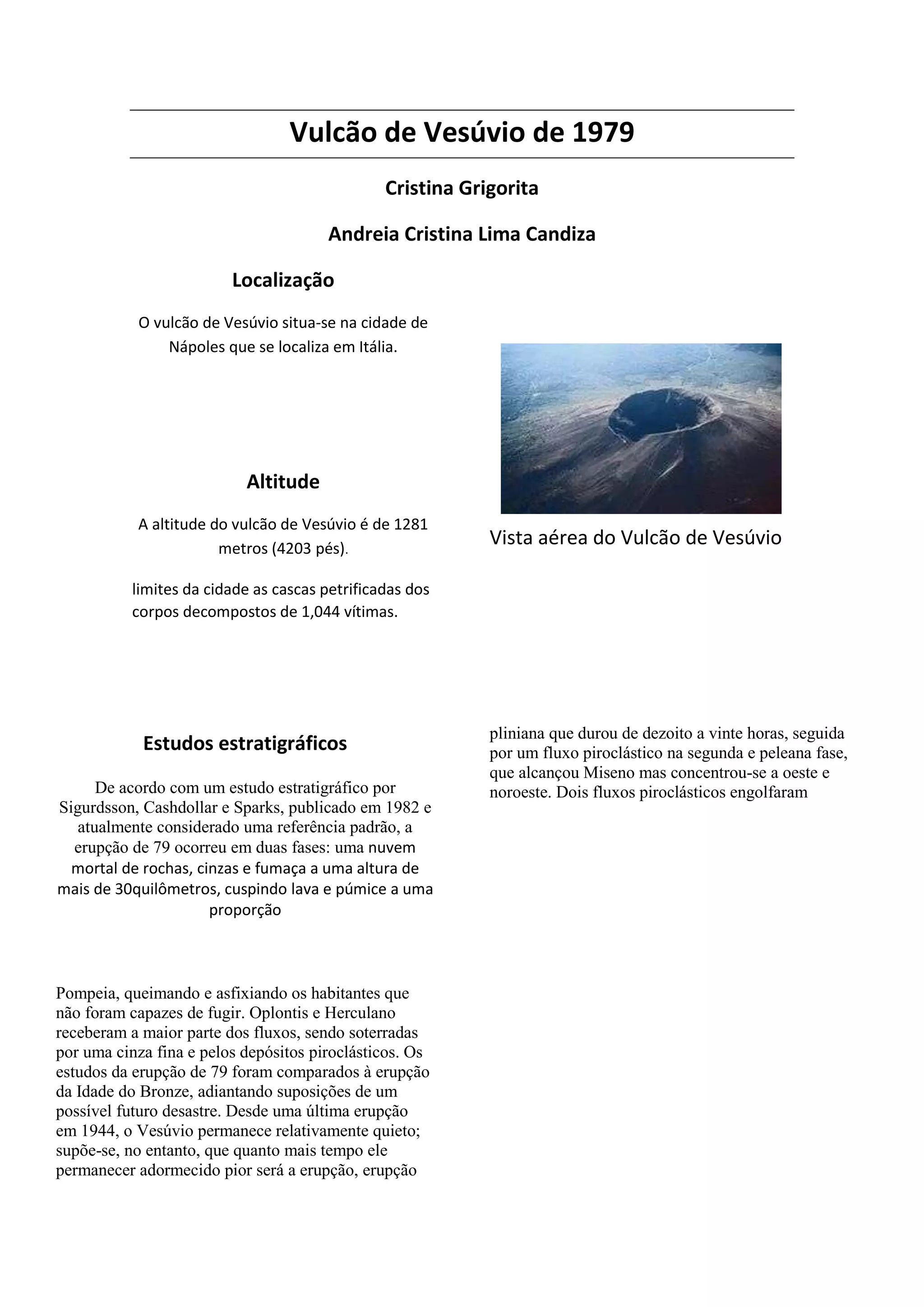 O documento descreve a erupção do vulcão Vesúvio em 79 d.C. que destruiu as cidades de Pompeia e Herculano. A erupção ocorreu em duas fases, primeiro uma nuvem quente de cinzas e gases, seguida por fluxos de lava e cinzas que soterrou as cidades. O estudo da erupção fornece insights sobre possíveis futuros desastres do vulcão.