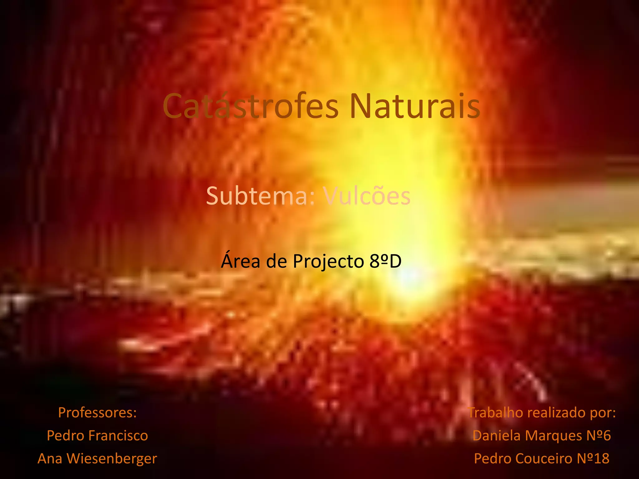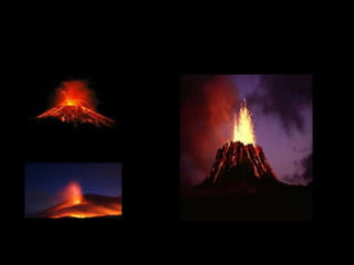 Este documento descreve os vulcões, suas erupções e produtos. Vulcões ocorrem onde placas tectônicas se encontram e magma sobe à superfície através de erupções efusivas, explosivas ou estrombolianas, emitindo lava e rochas piroclásticas. Fluxos piroclásticos são nuvens quentes e perigosas que podem viajar a 160km/h. Hot spots como o Havaí são vulcões não ligados a limites de placas.