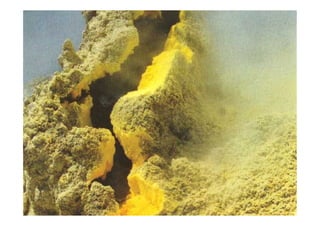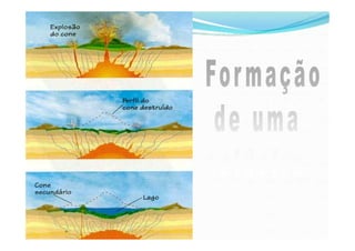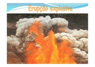 O documento discute os conceitos básicos da vulcanologia, incluindo o que é um vulcão, os tipos de vulcanismo primário e secundário, os materiais expelidos durante erupções vulcánicas como lava, piroclastos e gases, e como as lavas se consolidam em diferentes formas dependendo de sua viscosidade.