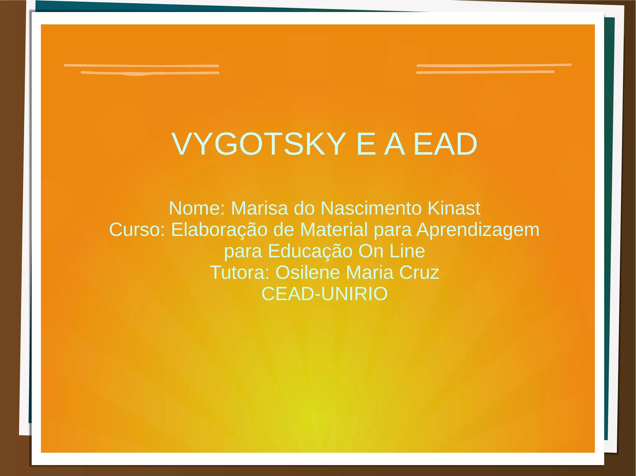Lev Vygotsky nasceu na Rússia em 1896 e estudou Direito e Filologia. Sua teoria valoriza o desenvolvimento cognitivo por meio da interação social, propondo três zonas de desenvolvimento: real, proximal e potencial. Sua obra encaixa-se na Educação a Distância por promover a mediação e compartilhamento de ideias entre professores e alunos.