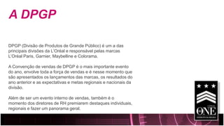 O documento descreve a Convenção de Vendas de 2014 da DPGP (Divisão de Produtos de Grande Público) da L'Oréal, que apresentou as estratégias e lançamentos de marcas como L'Oréal Paris, Garnier e Maybelline aos vendedores por meio de atividades e ações que remetiam ao conceito de um "Exército da Beleza".