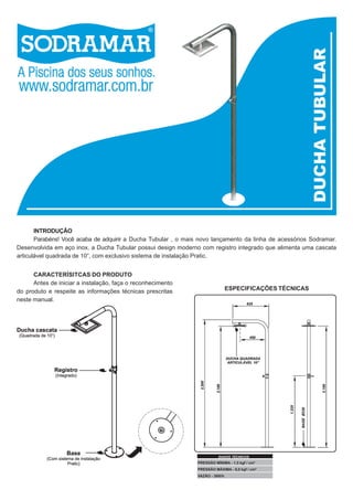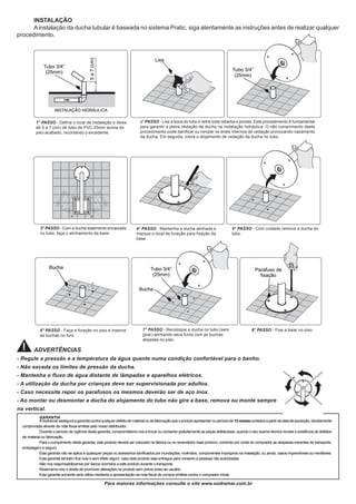 O documento fornece instruções para instalação de uma ducha tubular, incluindo 8 etapas como definir a localização, preparar o tubo, alinhar a base, furar o piso e fixar a base. Também descreve especificações técnicas, advertências de uso e uma garantia de 12 meses contra defeitos de fabricação.