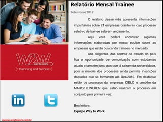 O documento fornece um resumo de 21 processos seletivos de trainees abertos em empresas brasileiras no mês de setembro de 2012, destacando as oportunidades nas empresas Cielo e Mars/Heineken. O relatório é produzido pela consultoria Way to Work para diretores de centros de estudo sobre carreiras e estágios.