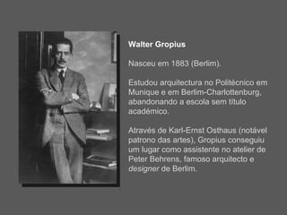 Walter Gropius fundou a Bauhaus em 1919 na Alemanha para combinar arte e tecnologia. A escola mudou-se para Dessau em 1925 onde Gropius projetou edifícios icônicos com estruturas de vidro e aço. A Bauhaus encerrou em 1932 sob pressão política, mas seu legado influenciou o design moderno globalmente.