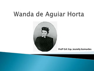 O documento descreve a vida e carreira da Profa Enf. Esp. Jessielly Guimarães, incluindo sua formação acadêmica e contribuições à enfermagem. Apresenta também conceitos e teorias fundamentais para a enfermagem, como as leis do equilíbrio, adaptação e holismo e o processo de enfermagem segundo Horta.