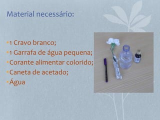 Este documento fornece instruções para colorir um cravo branco usando corante alimentar. Ele lista os materiais necessários e as etapas do processo, que envolvem colocar o cravo em uma garrafa com água e corante e observar a flor mudando de cor ao longo de alguns dias.