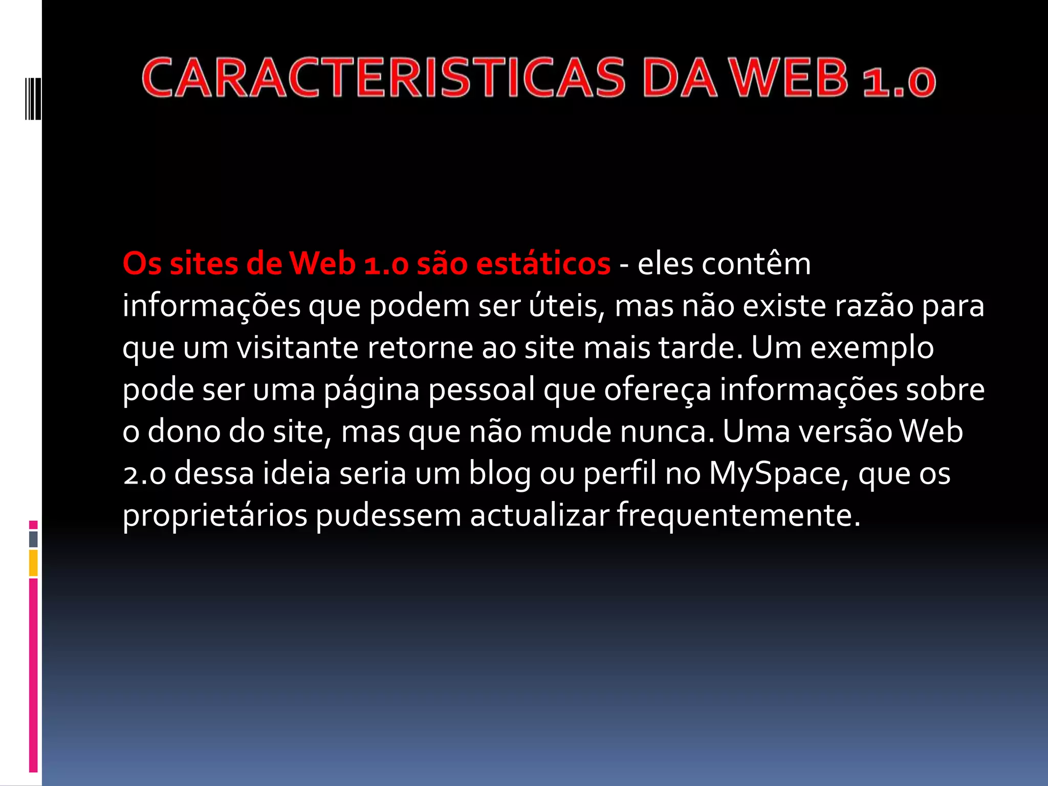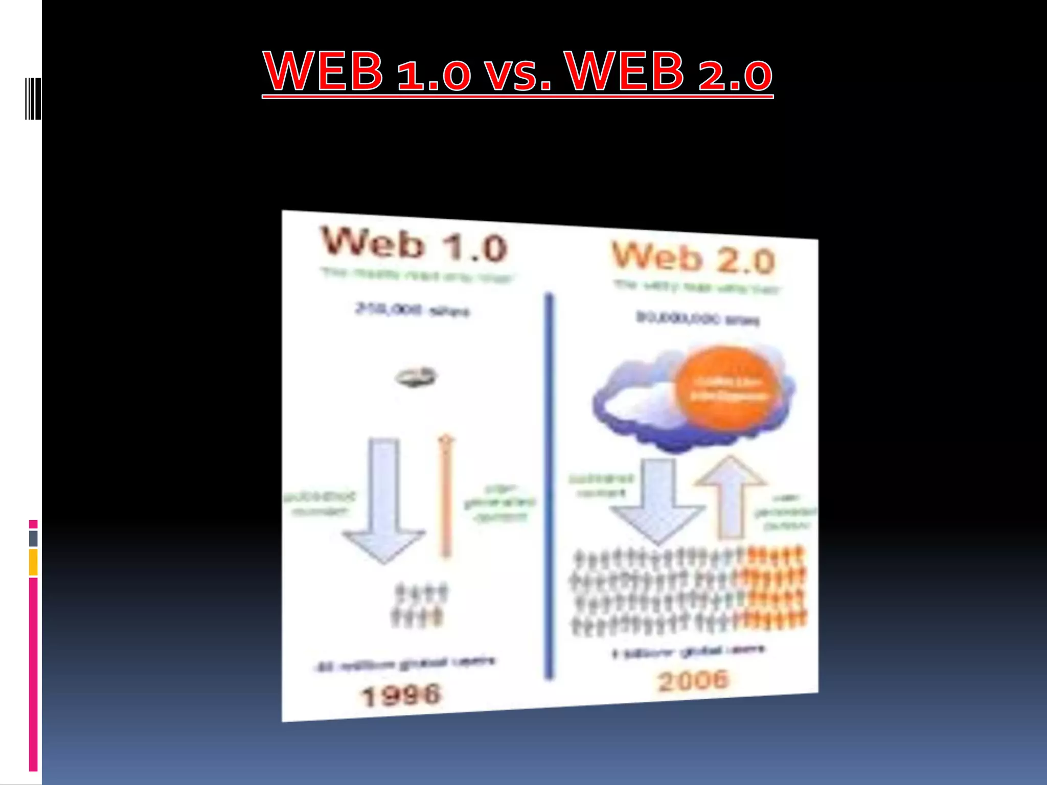 Os sites da Web 1.0 são estáticos e não interativos, enquanto os da Web 2.0 permitem atualizações frequentes e contribuições dos usuários por meio de blogs, wikis e redes sociais. A Web 1.0 tem aplicativos fechados, ao passo que a Web 2.0 usa software de código aberto que pode ser modificado. A Web 2.0 tornou-se uma plataforma para serviços online acessíveis de qualquer lugar.