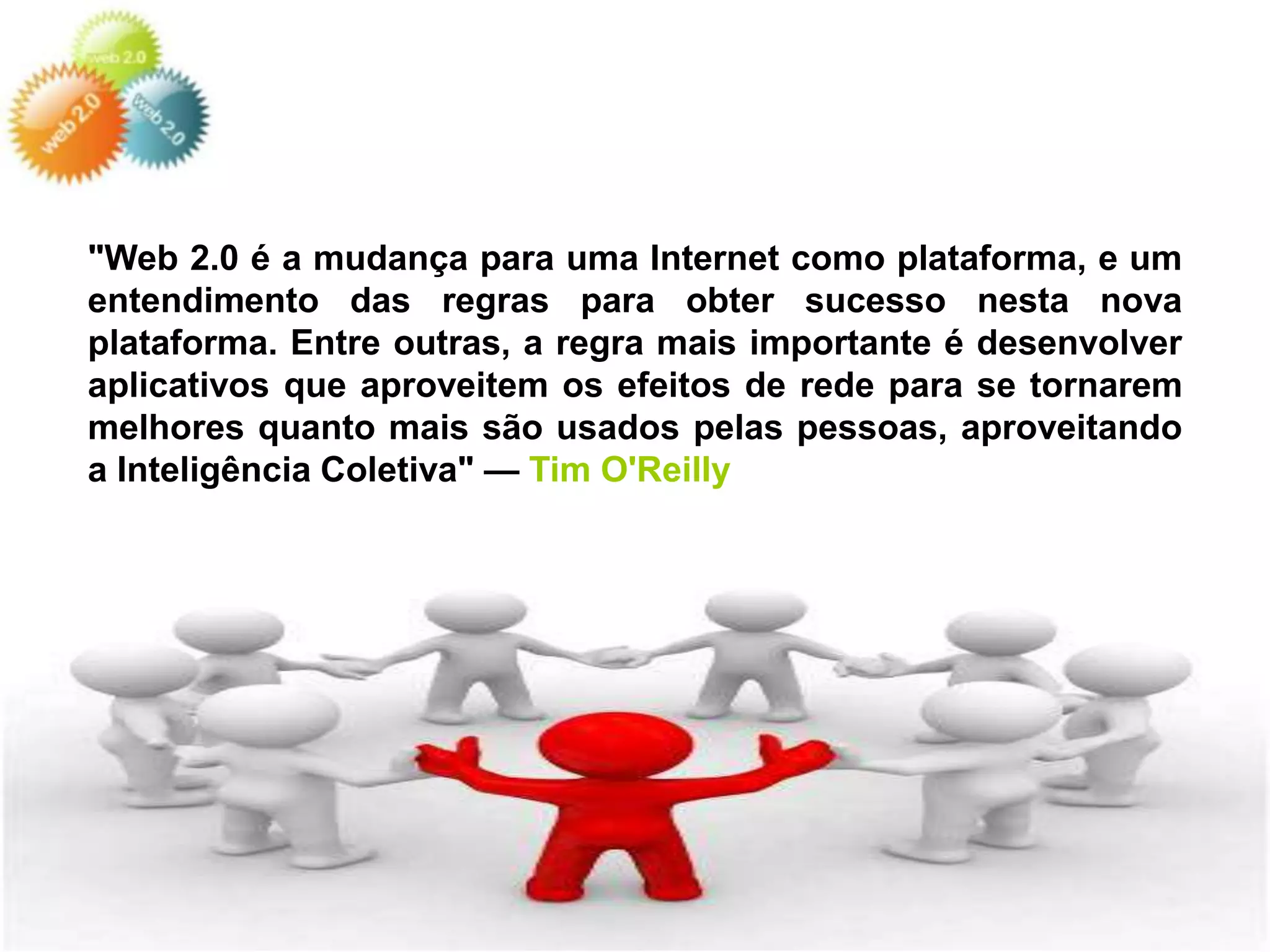 "Web 2.0 éa mudança para uma Internet como plataforma, e um entendimento das regras para obter sucesso nesta nova plataforma. Entre outras, a regra mais importante é desenvolver aplicativos que aproveitem os efeitos de rede para se tornarem melhores quanto mais são usados pelas pessoas, aproveitando a Inteligência Coletiva" — TimO'Reilly