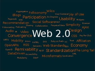 O documento discute a noção de Web 2.0 e fornece exemplos de aplicações Web 2.0, incluindo o Facebook. Ele define Web 2.0 como uma plataforma que permite a colaboração e compartilhamento de informações entre usuários. Exemplos de aplicações Web 2.0 incluem wikipédia, Google Maps, YouTube e aplicativos para editar documentos, fotos e projetos. Finalmente, o documento menciona que exemplos de aplicações Web 2.0 em educação serão fornecidos.