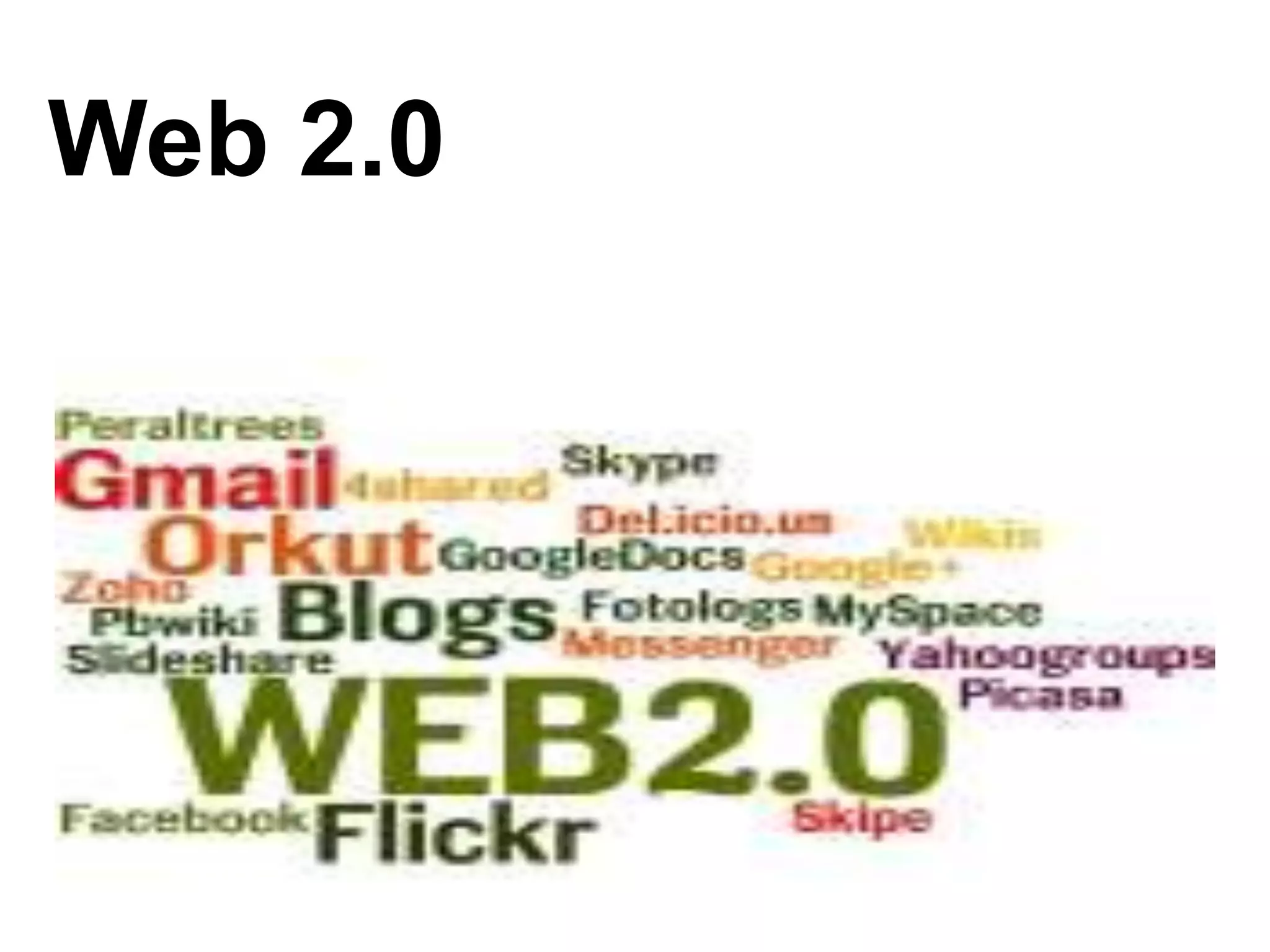 A Web 2.0 é uma segunda geração de serviços e comunidades na Web que permitem a construção coletiva de conhecimento através da interação e compartilhamento de conteúdos como textos, imagens, áudio e vídeo em formatos como blogs, wikis e redes sociais. Exemplos de serviços da Web 2.0 incluem Google, Wikipédia, Gmail, Skype e redes sociais que permitem comunicação, edição e compartilhamento colaborativo de conteúdo.