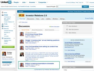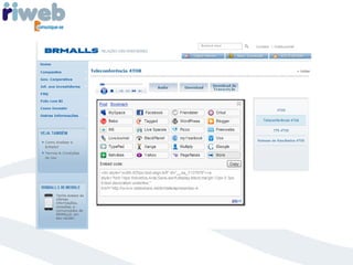 O documento discute a evolução da Web. A Web 1.0 era estática e offline, enquanto a Web 2.0 é dinâmica, online e colaborativa, permitindo comentários, blogs, compartilhamento e mídias sociais. Apresenta também o conceito de Web 3.0 e aponta como o departamento de relações com investidores pode utilizar ferramentas da Web 2.0 para se comunicar melhor com os investidores.