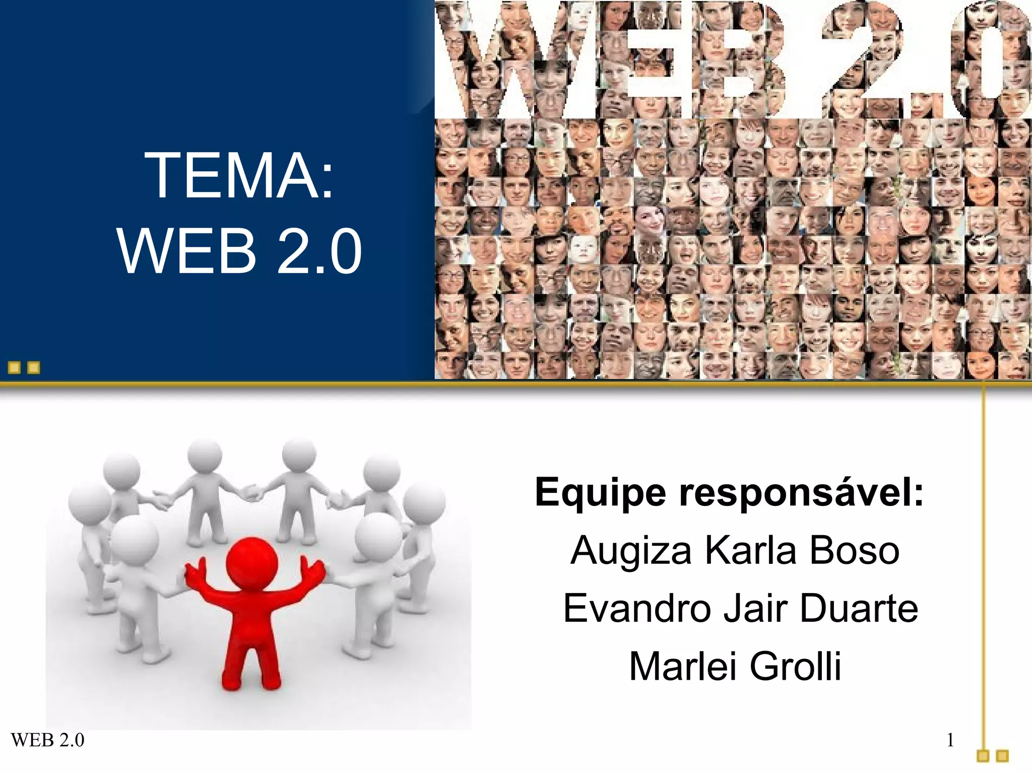 O documento apresenta uma introdução sobre a Web 2.0, descrevendo sua histórico e definição segundo Tim O'Reilly. Em seguida, descreve as principais ferramentas da Web 2.0, como Delicious, Gmail, Picasa, Flickr, wikis, blogs, Twitter, Orkut, Facebook e YouTube. Por fim, aborda outros recursos como mapas, dados georreferenciados e mashups.