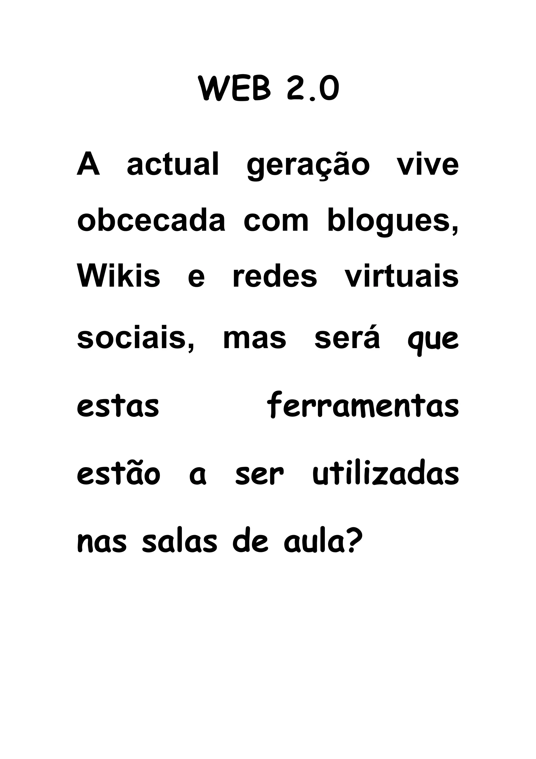 Este documento discute como as ferramentas da Web 2.0 como blogs e wikis podem ser utilizadas nas salas de aula. Ele explica que estas ferramentas atraem as crianças e permitem que elas criem e publiquem conteúdo online. Também fornece diretrizes para como os professores podem começar a incorporar essas ferramentas em suas aulas, começando com um blogue da turma.