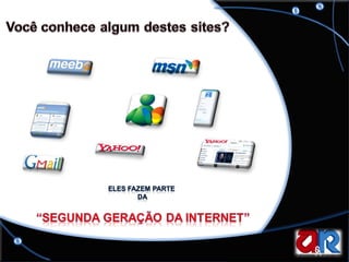 A Web 2.0 representa uma mudança na internet com sites que se tornam melhores à medida que os usuários interagem e colaboram, compartilhando informações. Isso torna a internet mais dinâmica e interativa, embora alguns critiquem o termo como marketing. Exemplos como Orkut, YouTube e MySpace mostram como os usuários estão ativos na internet graças à tecnologia que permite a colaboração.