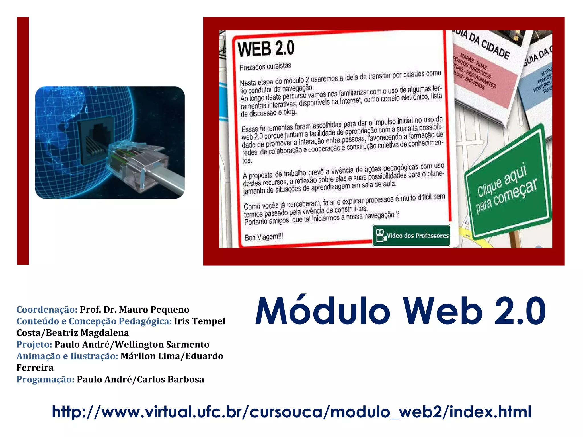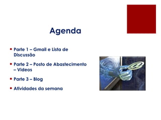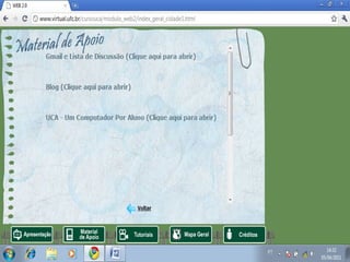 O documento descreve as etapas de um módulo sobre Web 2.0, incluindo o uso de e-mail e listas de discussão no Gmail. Nas primeiras etapas, os participantes criam uma conta no Gmail, enviam e-mails e se inscrevem em uma lista de discussão. Exemplos de uso pedagógico dessas ferramentas em sala de aula também são apresentados.