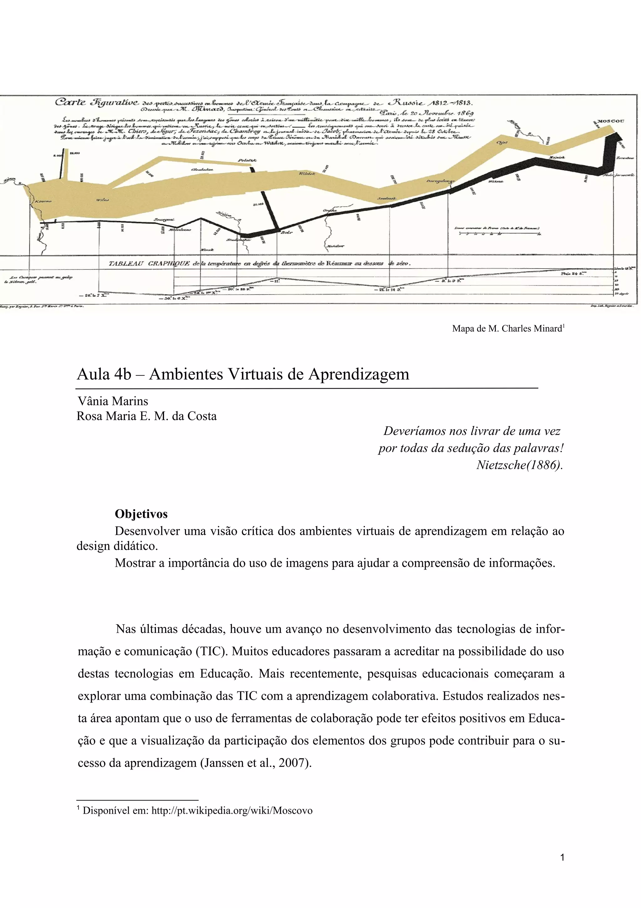 Este documento discute o uso de ambientes virtuais de aprendizagem (AVA) na educação a distância e apresenta algumas críticas a esses ambientes. Também aborda a importância da visualização de informações por meio de imagens e gráficos para apoiar a compreensão dos estudantes.