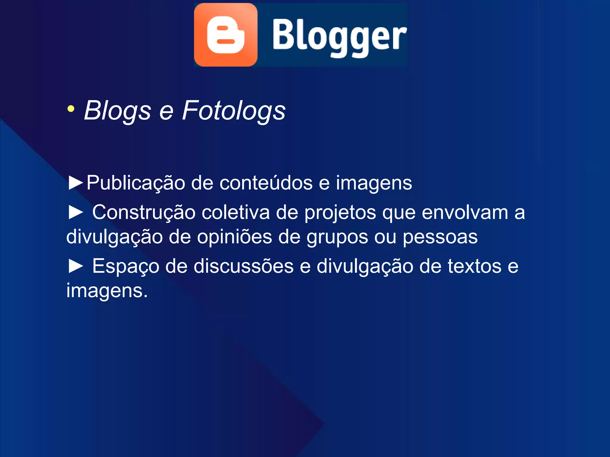 Blogs e Fotologs► Publicação de conteúdos e imagens ► Construção coletiva de projetos que envolvam a divulgação de opiniões de grupos ou pessoas ► Espaço de discussões e divulgação de textos e imagens.