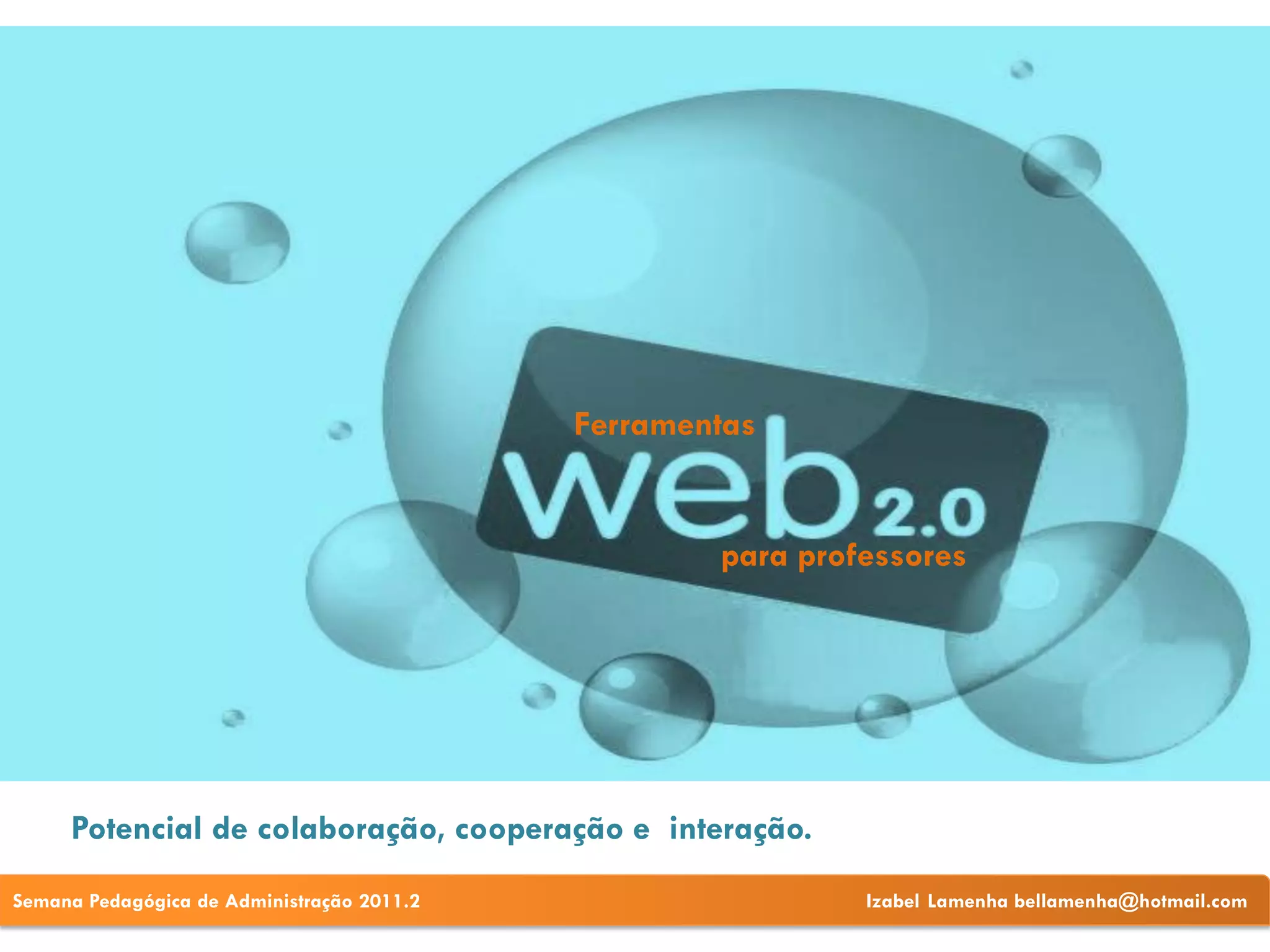 O documento discute as ferramentas da Web 2.0 para professores, com o objetivo de promover a interação e o compartilhamento de conhecimento. Ele explica conceitos como Web 2.0 e suas características principais, como permitir a construção coletiva do conhecimento. Além disso, apresenta exemplos de ferramentas como blogs, redes sociais e sites para serem usadas em sala de aula.