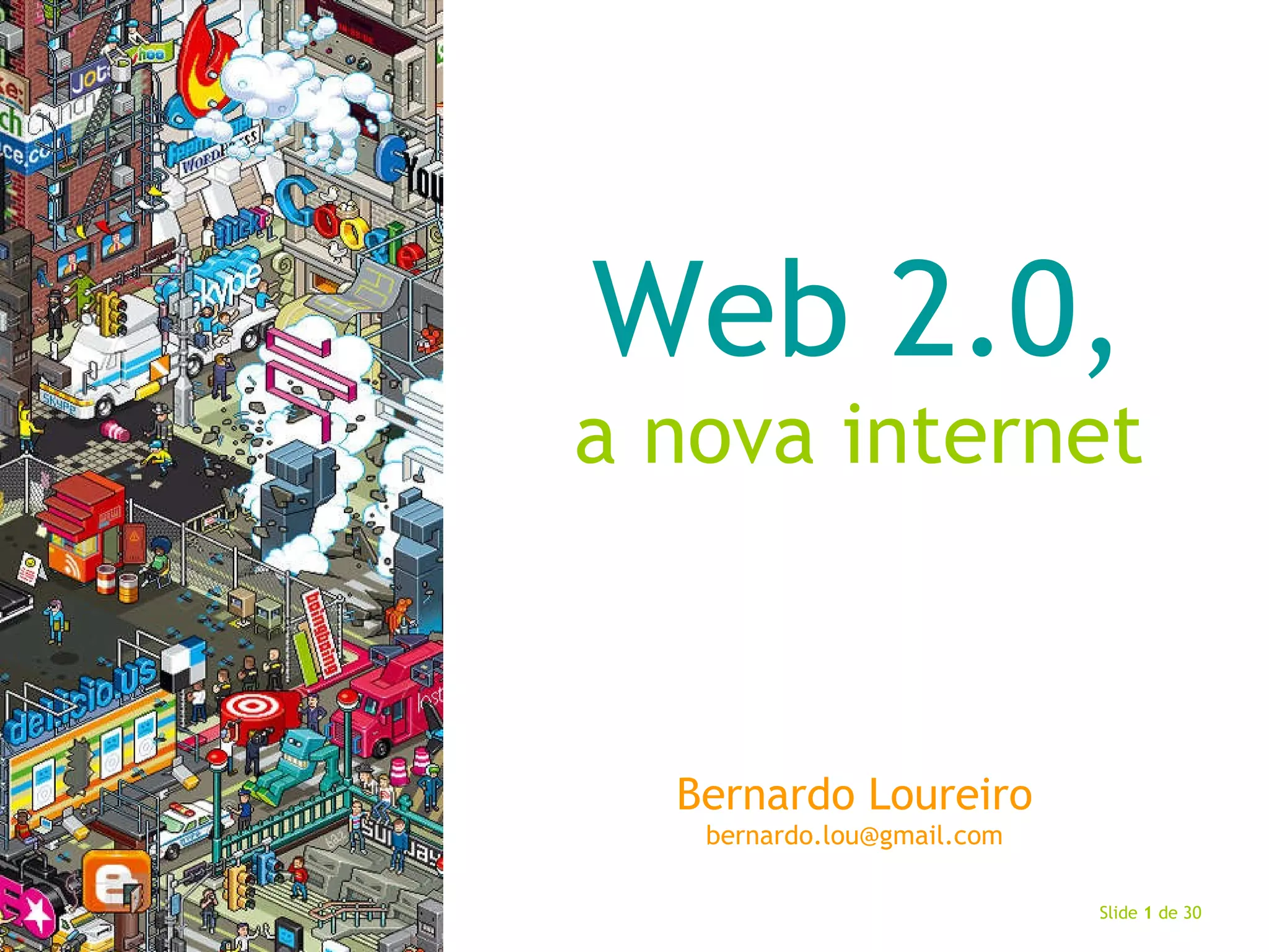 O documento discute a evolução da internet para a Web 2.0, caracterizando-a como uma plataforma colaborativa e interativa que democratiza a geração de conteúdo. Destaca a importância de ferramentas como blogs, wikis, redes sociais e RSS na troca de informações e na construção de comunidades online. Além disso, aborda como essa nova abordagem foca na experiência do usuário e na simplicidade, apresentando novas oportunidades de negócios na era digital.