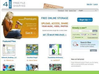 O documento descreve o que é a Web 2.0, caracterizada por uma segunda geração da World Wide Web que permite a troca e colaboração de informações entre sites e serviços online, onde os usuários participam ativamente na organização dos conteúdos. O texto também lista exemplos de sites que ilustram esses conceitos da Web 2.0, incluindo wikis, blogs, microblogs, compartilhamento de fotos e arquivos online.
