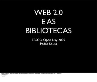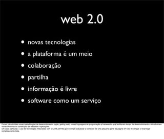 O documento discute as mudanças trazidas pela Web 2.0, incluindo maior foco na colaboração e compartilhamento de conteúdo. Também explora como as bibliotecas podem aproveitar essas novas tecnologias para melhorar os serviços e pesquisa online de usuários.