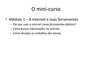 Este documento discute o uso da internet e ferramentas da Web 2.0 como recursos didáticos. Ele explica por que a internet pode ser uma ferramenta útil na educação, como buscar informações online e divulgar trabalhos de alunos usando blogs ou outros meios.