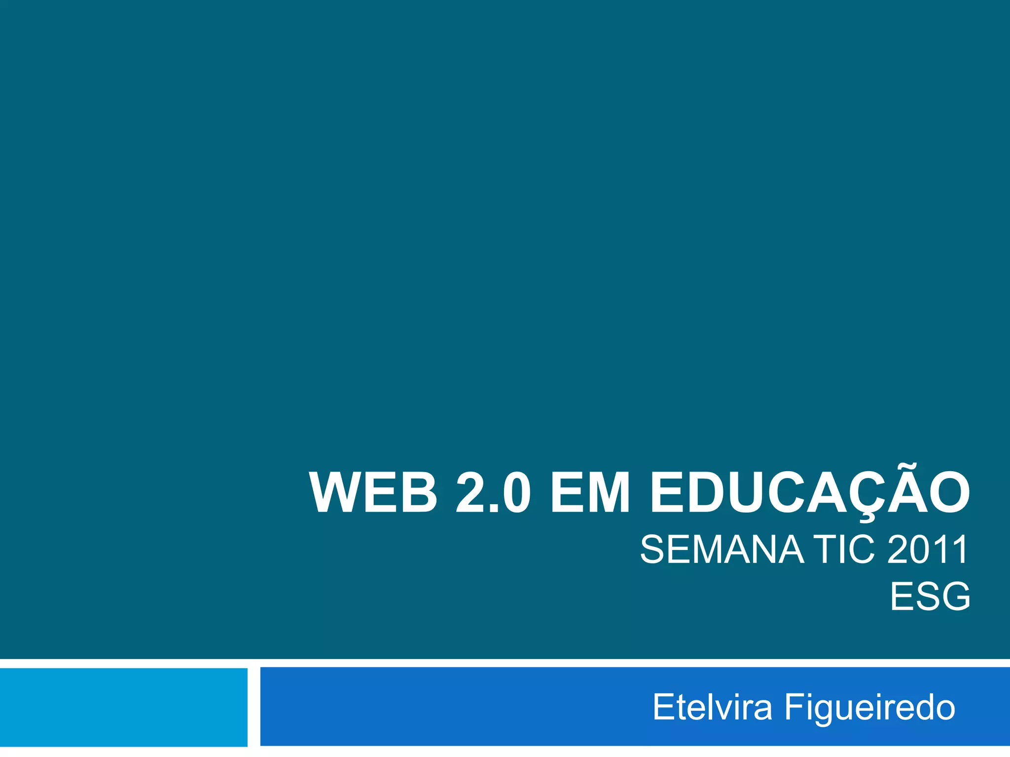 Este documento discute o conceito de Web 2.0 e suas características, bem como suas aplicações para a educação. Ele descreve como a Web 2.0 permite a comunicação em rede e a aprendizagem construtivista através da prática e reflexão. Várias ferramentas Web 2.0 são apresentadas, incluindo ferramentas de imagem, áudio, vídeo e integradoras multimídia como wikis e blogs.