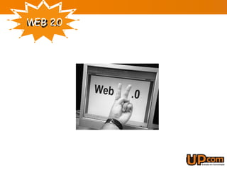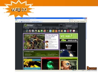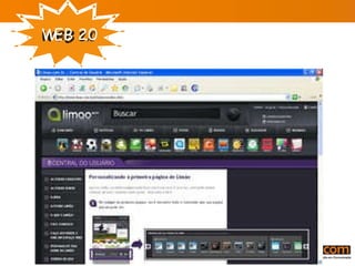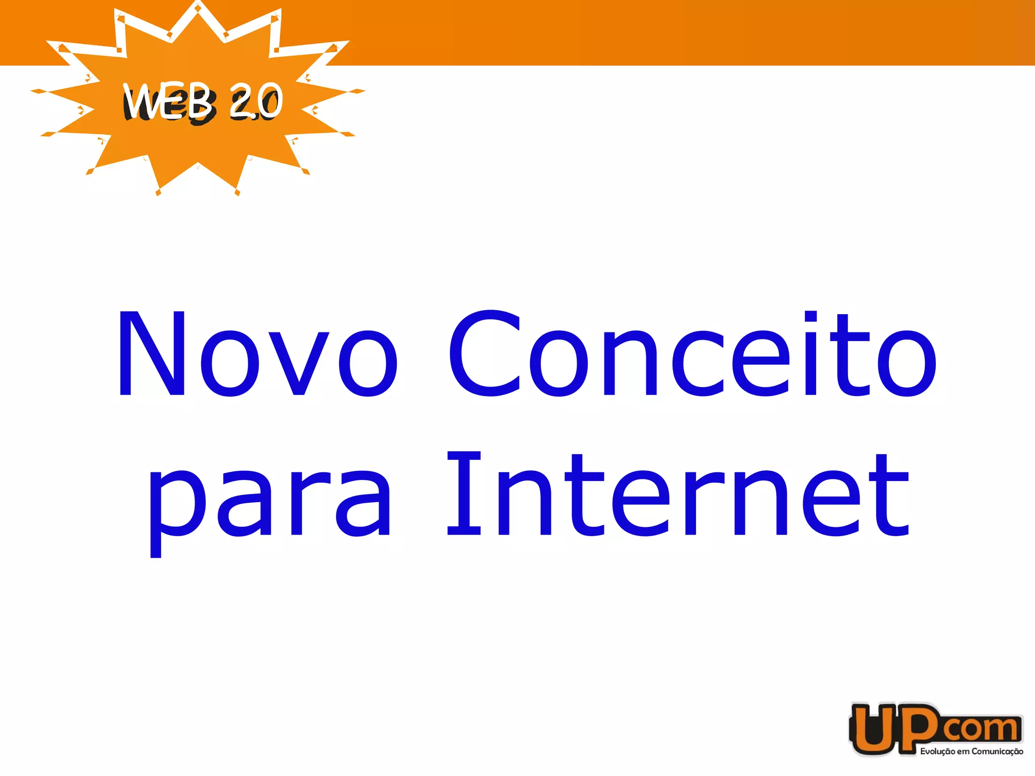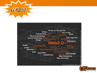 O documento discute o conceito de Web 2.0, definido como uma mudança para a internet como plataforma onde os usuários geram conteúdo de forma colaborativa. A Web 2.0 enfatiza a interatividade, permitindo que os usuários editem e organizem informações em sites como a Wikipédia. Ferramentas como blogs, tags e wikis permitem a troca de informações e a geração colaborativa de conteúdo.