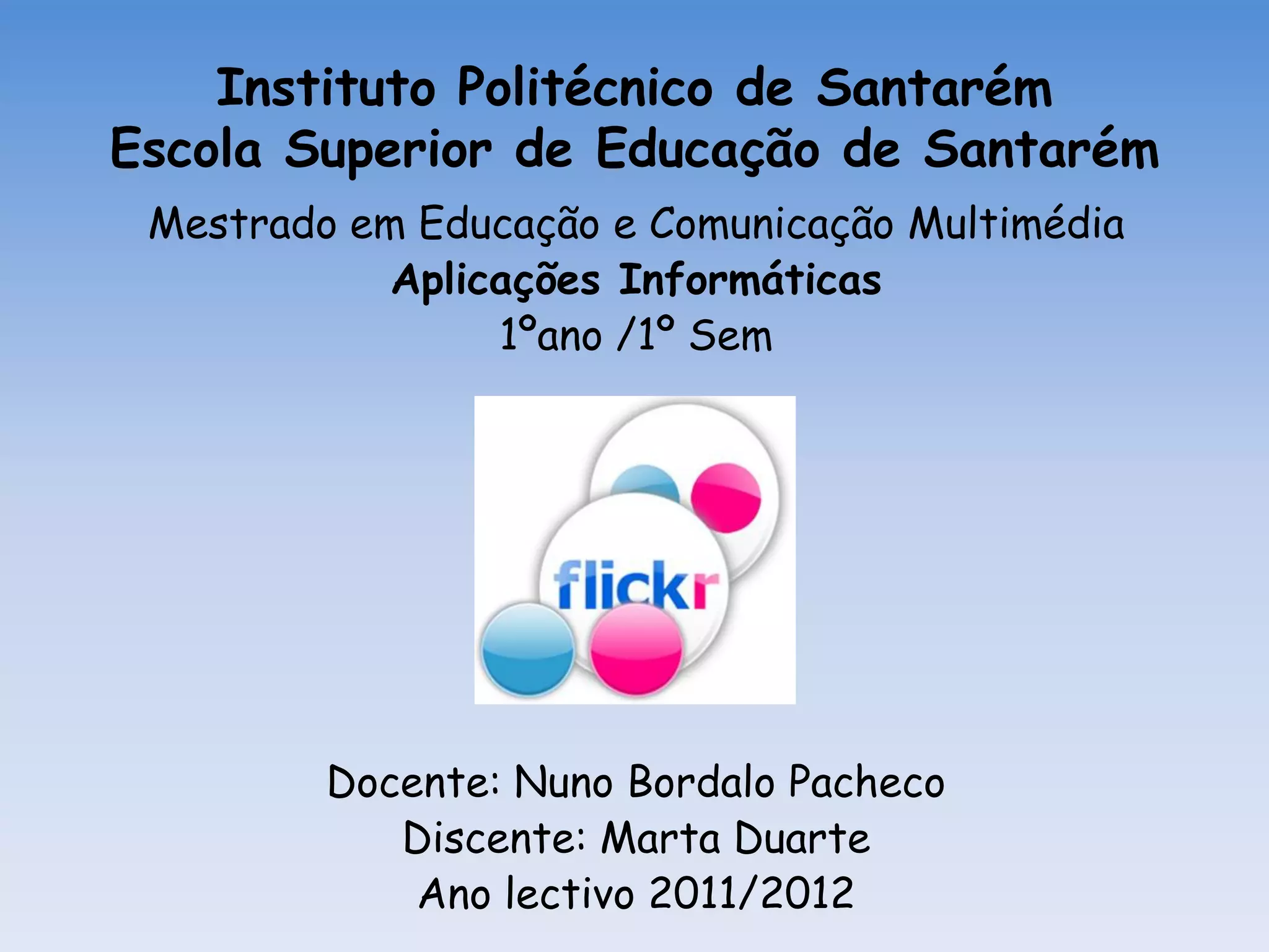 Este documento descreve o Flickr, um site de hospedagem e compartilhamento de fotos. O Flickr permite que usuários criem álbuns para armazenar e compartilhar fotos com amigos e familiares. O documento explica o histórico do Flickr, seus recursos e como criar uma conta no site.