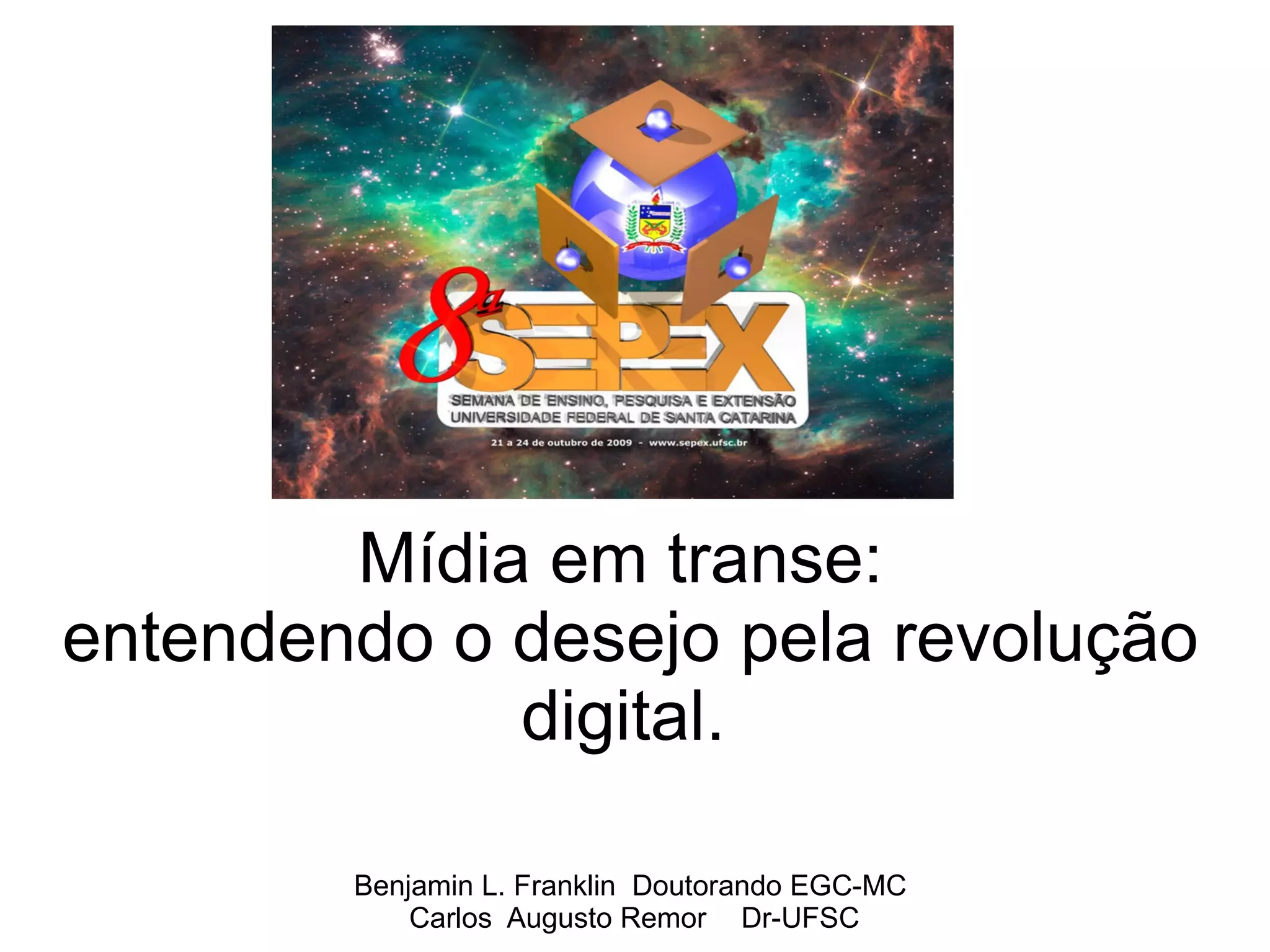 O documento discute as forças por trás da revolução digital e como elas operam. Apresenta como a indústria fonográfica vem sofrendo perdas de vendas anuais de mais de 10% devido ao compartilhamento de arquivos na internet. Também mostra como as novas tecnologias como VOIP, IPTV e Youtube estão transformando a mídia e a sociedade.