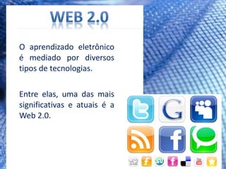 O documento discute como a Web 2.0 permite o aprendizado eletrônico através da criação e compartilhamento colaborativo de conteúdo por usuários. Algumas das ferramentas mais conhecidas são wikis, blogs e redes sociais como Flickr, que possibilitam a prática de habilidades, comunicação e desenvolvimento intelectual.
