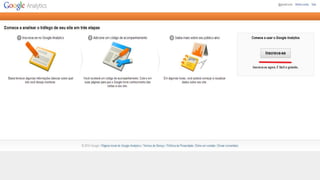 Web Analytics permite mensurar o sucesso e propor melhorias em um ciclo virtuoso de medição, análise, diagnóstico e implementação para aumentar a conversão. O Google Analytics é uma ferramenta gratuita e completa para analisar métricas como visitas, visitantes, visualizações de páginas, taxa de rejeição, fontes de tráfego e duração das sessões para responder perguntas que otimizem o negócio.