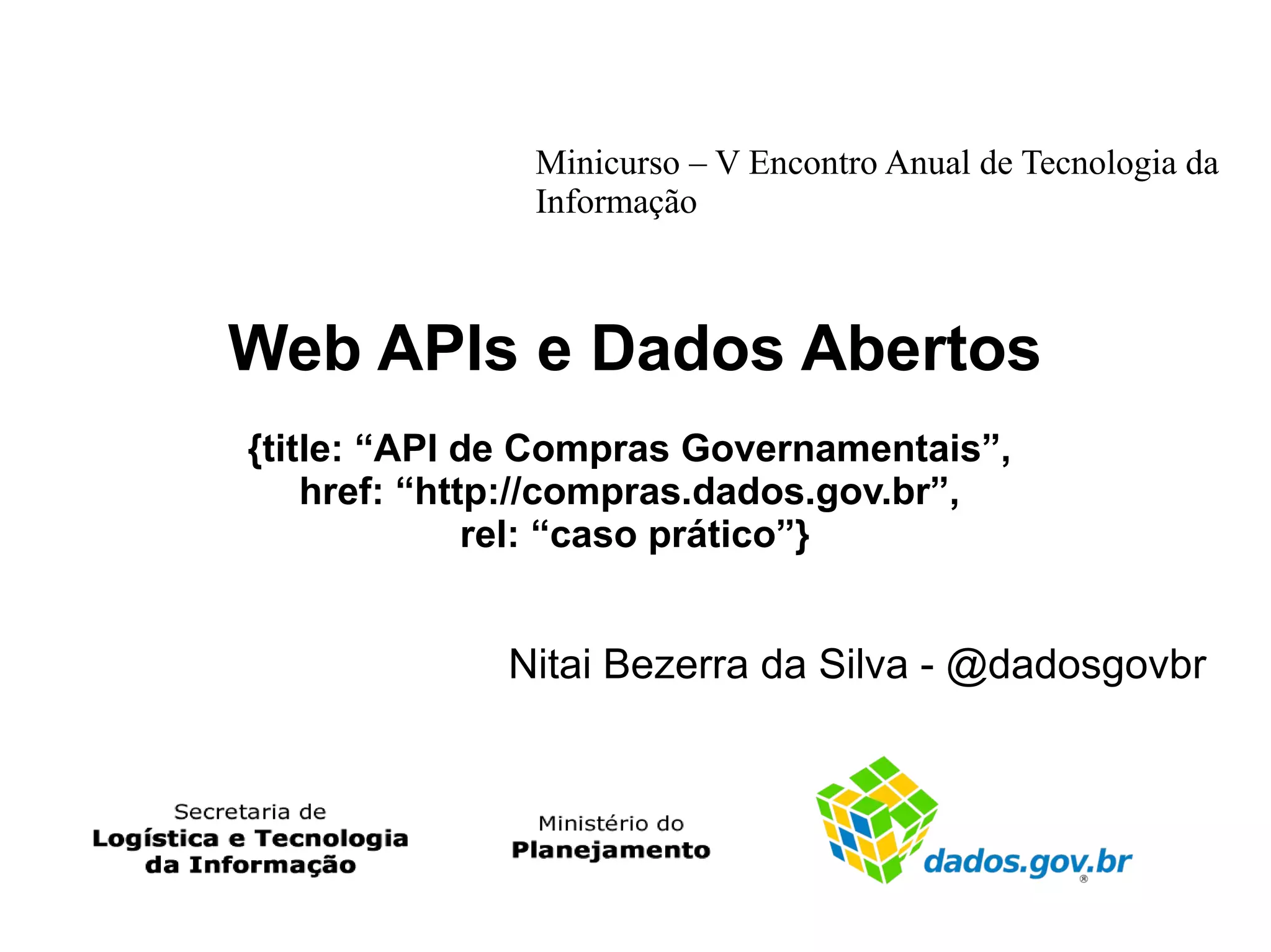 1) O documento apresenta uma API do governo brasileiro sobre compras governamentais. 2) A API tem o objetivo de disponibilizar os dados de forma aberta e padronizada para que desenvolvedores criem aplicações que gerem valor para a sociedade. 3) O documento explica como a API é construída e como realizar consultas aos seus recursos em formatos como JSON, CSV e XML.
