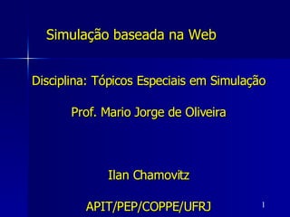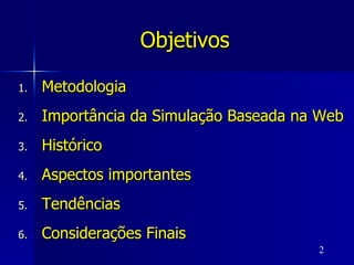 O documento discute a simulação baseada na web, seu histórico, metodologia, importância e tendências. Ele descreve como a web foi criada no início dos anos 90 e como a simulação baseada na web emergiu nos anos 90, com a primeira conferência em 1998. Também destaca aspectos como modelagem distribuída, educação, saúde e energia como áreas promissoras e a importância da cooperação, acesso e filtros nessa abordagem.