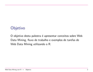 A palestra aborda conceitos de web data mining utilizando a linguagem R e destaca aplicações práticas como análise de mensagens do Twitter e desenvolvimento de algoritmos anti-spam. É discutido o fluxo de trabalho na extração de conhecimento a partir de dados não estruturados, além de técnicas de aprendizado de máquina. O documento conclui com considerações sobre a aplicabilidade dos métodos apresentados em outros contextos.