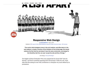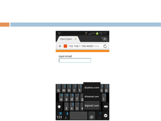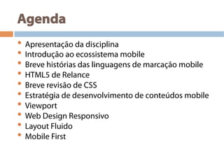 Este documento fornece um resumo sobre desenvolvimento de conteúdo web para dispositivos móveis. Apresenta estratégias como não fazer nada, conteúdo adaptado e versão móvel específica. Também discute breve história das linguagens móveis, HTML5, CSS e web design responsivo.