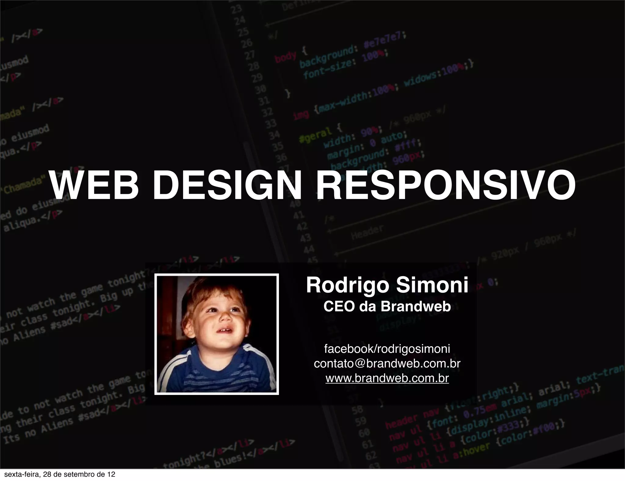 O documento discute o impacto dos dispositivos móveis no acesso à internet e apresenta o conceito de web design responsivo, que permite que sites se adaptem a diferentes telas de forma flexível. Ele explica como grids, imagens e mídia queries podem ser usados para criar sites responsivos e fornece exemplos de sites que utilizam essa abordagem.