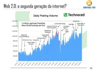 O documento descreve a evolução da internet e da Web 2.0. Começa com a história dos meios de comunicação desde o telégrafo, passando pela internet, até chegar à Web 2.0, caracterizada pelo compartilhamento de conteúdo e inteligência coletiva. Também discute o conceito de Web 2.0, casos exemplares e o papel do consumidor na era digital.