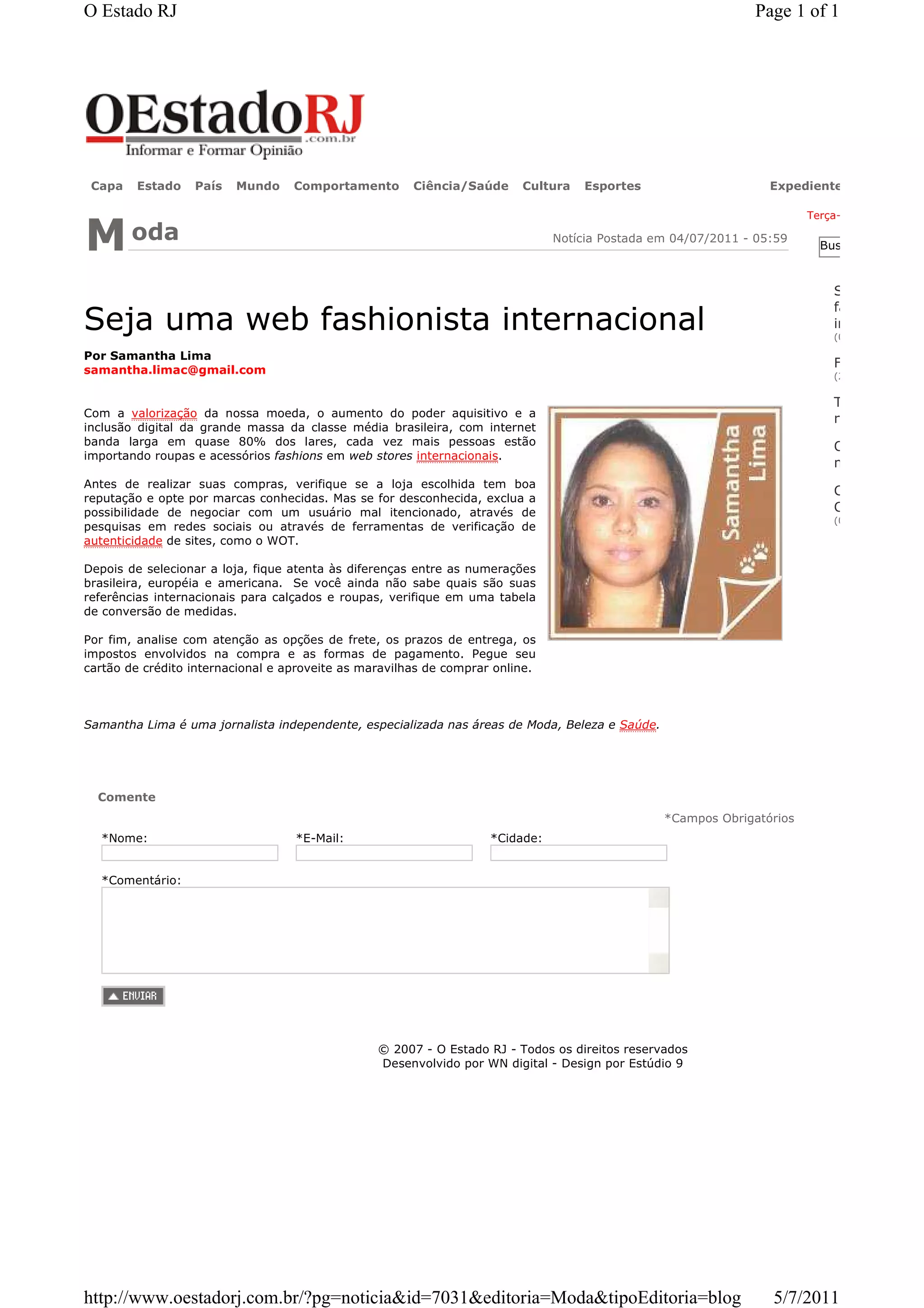 O documento fornece dicas para comprar roupas e acessórios de moda em lojas online internacionais de forma segura e atenta às diferenças de tamanho entre os países. A jornalista recomenda verificar a reputação das lojas, pesquisar sobre as marcas desconhecidas e ficar atenta às opções de frete, prazos de entrega e impostos.