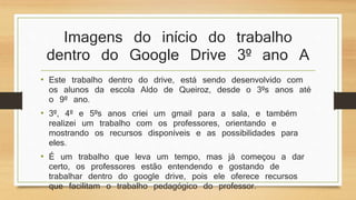 O documento relata o desenvolvimento de atividades com alunos da Escola Municipal Aldo de Queiroz utilizando o Google Drive, abrangendo do 3º ao 9º ano. Professores foram capacitados para utilizar recursos tecnológicos, promovendo atividades em diversas áreas como arte, poesia e pesquisas temáticas. As atividades envolveram a criação de emails, trabalho colaborativo e utilização de jogos educativos, melhorando a interação e o aprendizado dos alunos.
