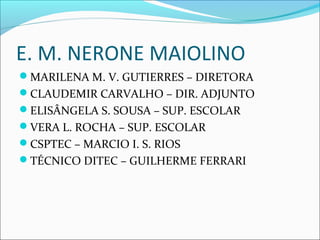 Este documento apresenta atividades realizadas na sala de informática da Escola Municipal Nerone Maiolino no 2o semestre de 2013. É descrito um exercício de Matemática do 6o ano sobre cálculo de média aritmética, moda e mediana com base em dados reais de batimentos cardíacos de estudantes. O documento explica como organizar os dados em uma tabela de distribuição de frequências e calcula as medidas estatísticas para os dados apresentados.