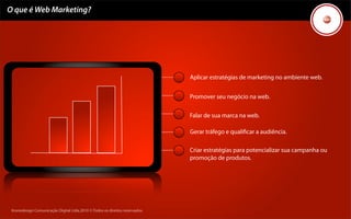 O documento apresenta a Kronedesign Comunicação Digital Ltda., especializada em web marketing, com foco em estratégias para promover marcas e gerar tráfego online. Destaca os serviços oferecidos, como gerenciamento de sites, e-mail marketing, publicidade digital e gestão de redes sociais, ressaltando a importância da personalização e mensuração das campanhas. Também menciona as vantagens do investimento em web marketing, como aumento de tráfego, atração de novos clientes e redução de custos de publicidade.