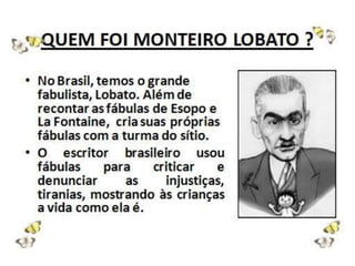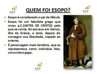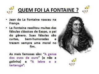 Este documento fornece instruções para uma atividade sobre fábulas. Os alunos devem se dividir em duplas, ler e identificar características de fábulas. Em seguida, eles devem criar personagens e escrever sua própria fábula com uma lição de moral, ilustrando e postando no blog. Links são fornecidos para pesquisa sobre fábulas e ditados populares.