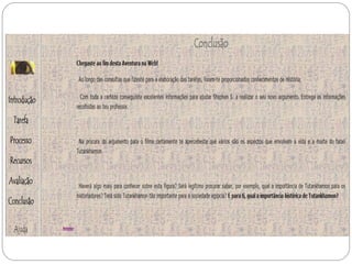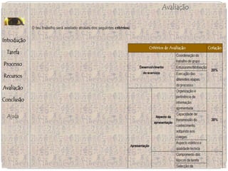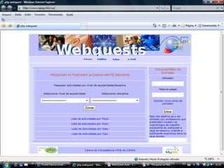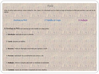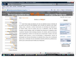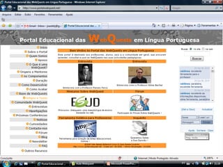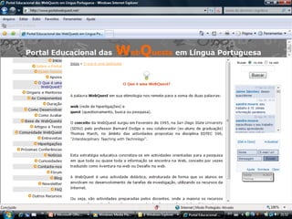 Este documento descreve a metodologia de ensino WebQuest, que utiliza recursos da internet para atividades de aprendizagem. A WebQuest envolve tarefas para os alunos que requerem pesquisa em sites específicos e geralmente termina com uma resposta ou produto final. O documento discute os componentes essenciais de uma WebQuest bem-sucedida e fornece exemplos de como ela pode ser aplicada no ensino.