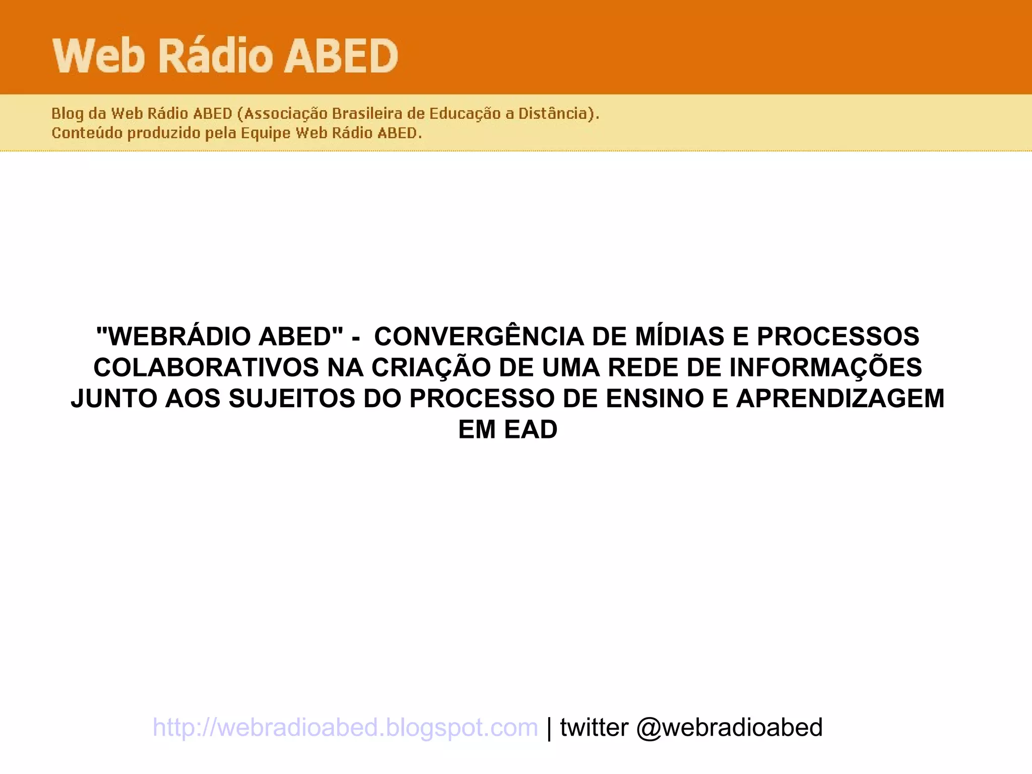 A Web Rádio ABED foi criada em 2007 para promover a discussão sobre o uso de novas linguagens e mídias na educação a distância. A rádio online permite a colaboração entre professores e estudantes e a disseminação de informações sobre eventos de educação. Atualmente conta com mais de 50 colaboradores e está presente em diversas redes sociais.
