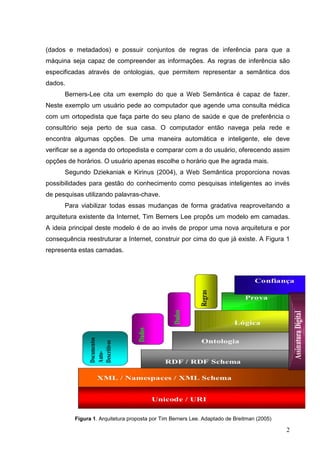 1) O documento discute a Web Semântica, incluindo seus conceitos, tecnologias e aplicações. 2) A Web Semântica visa dar significado às informações na web para que computadores possam processá-las de forma autônoma. 3) Isso é feito através de ontologias e linguagens como RDF, RDFS e OWL que estruturam os dados e seus relacionamentos semânticos.