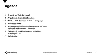 O documento apresenta uma introdução sobre web services, incluindo sua arquitetura, WSDL, protocolo SOAP e abordagens de desenvolvimento bottom-up e top-down. Dois exemplos de web services usando JDeveloper 12c são descritos.
