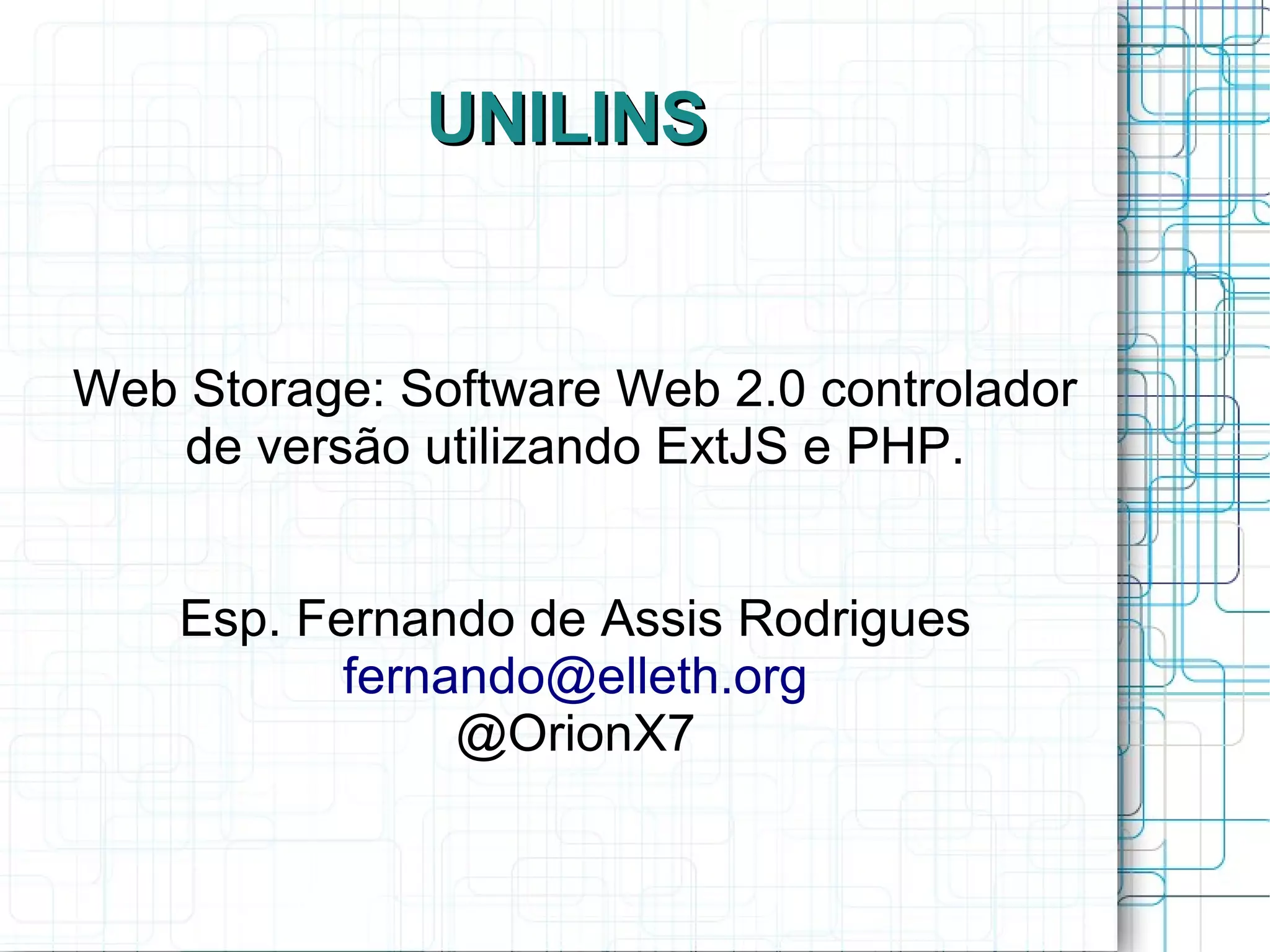 O documento discute o sistema de controle de versão SVN, destacando suas principais características como commit, links simbólicos para versões e estrutura básica de trunk, branches e tags. Também apresenta o framework JavaScript ExtJS, enfatizando seu uso para criar aplicações web ricas semelhantes a desktops e sua popularidade entre empresas.