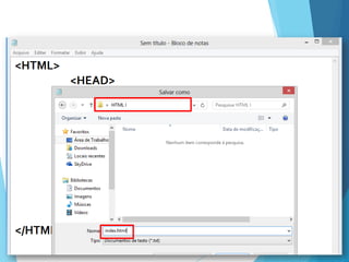 Este documento fornece instruções sobre como construir um site HTML simples em três etapas: 1) Utilizando tags HTML básicas como <HTML>, <HEAD>, <TITLE>, <BODY> para estruturar o site; 2) Salvando o arquivo como "index.html"; 3) Adicionando formatação simples como quebras de linha e tags para negrito, itálico e sublinhado.