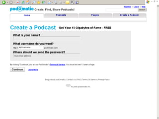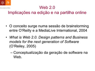 O documento descreve a Web 2.0, incluindo sua conceituação inicial em 2004, seus principais princípios como a Web como plataforma e dados como força motriz, e exemplos de ferramentas Web 2.0 como blogs, podcasts, wikis e bookmarking social.